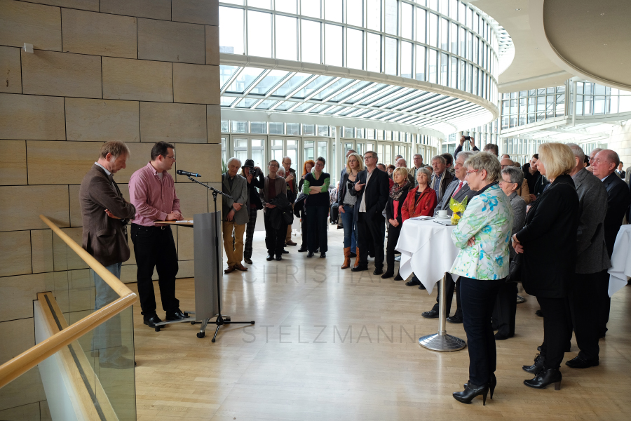 Ausstellungseröffnung im Landtag NRW am 28.04.2014, Düsseldorf Fotograf Thomas Stelzmann muss auch ran. Reden halten ist nicht wirklich das Metier von Fotografen, die sich des Platzes hinter der Kamera wohl bewusst sind und ihn selnst gewähöt haben. Wichtig ist stets der, der VOR der Kamera steht, nicht die Person dahinter.
